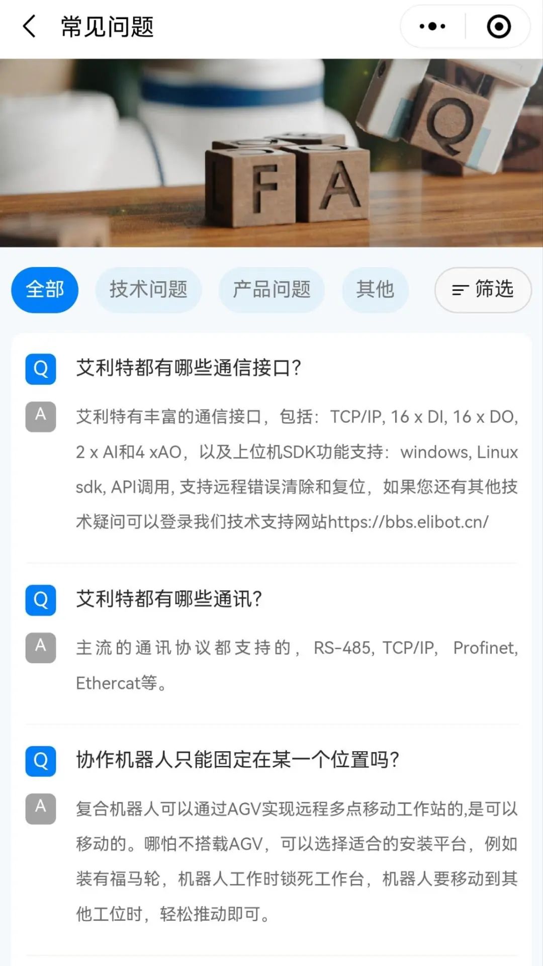 为帮助用户更直观了解星空xk协作机器人的操作注意事项及常见问题解决方法,小程序还设置【常见问题】板块,让解决问题快人一步!