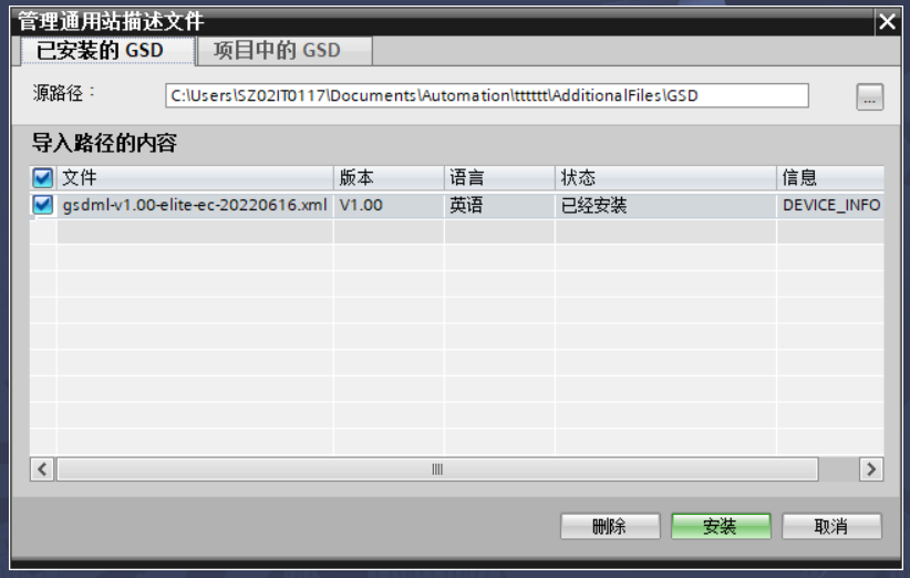 将下面链接的星空xk机器人GSD 文件安装到 TIA PORTAL 中管理通用描述文件,如图 2-2 所示。