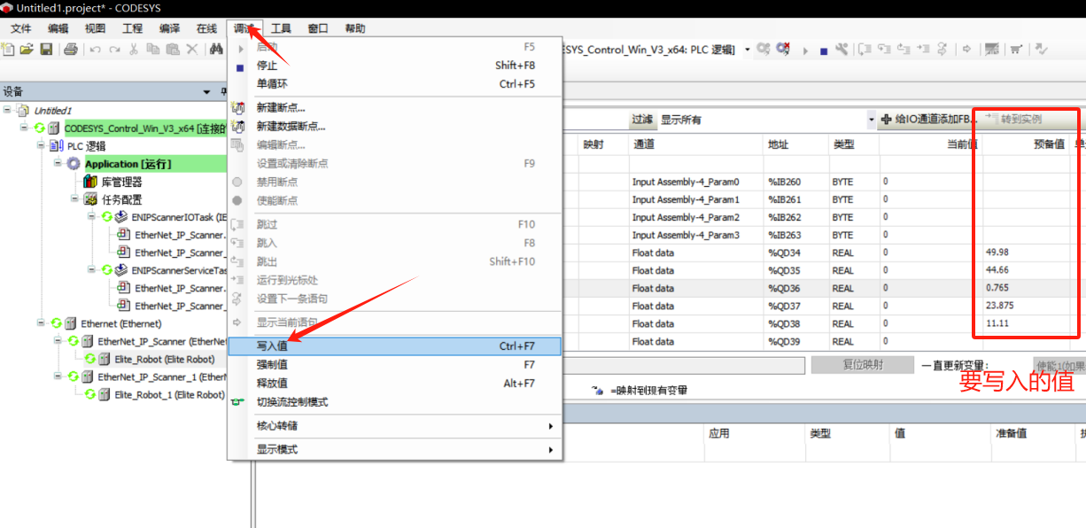 Float 输入,将 codesys 数值发送到机器人变量,D000-D004 关联到 Adapter Slot 3 输入前 5 个数值,数据变化一致