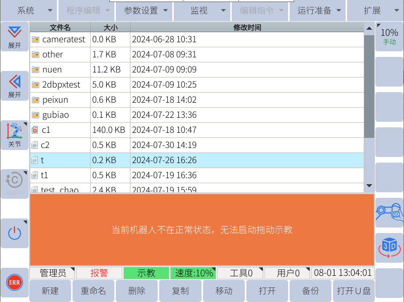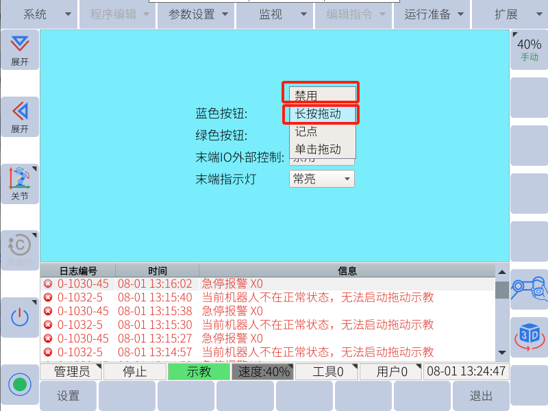 当机器人存在报警时也无法启动拖动功能,需清除报警后才能启用拖动