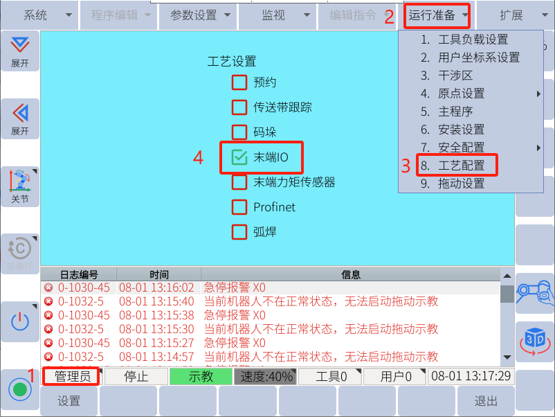 管理员权限下点击运行准备--工艺配置,查看是否勾选了末端IO(默认勾选)