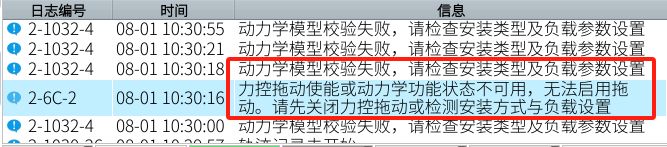 当显示动力学模型校验失败时,首先检查安装方式(运行准备--安装设置)和工具负载参数设置(运行准备--工具负载设置),当安装方式不正确、负载参数设置相差过大,则无法启动拖动。