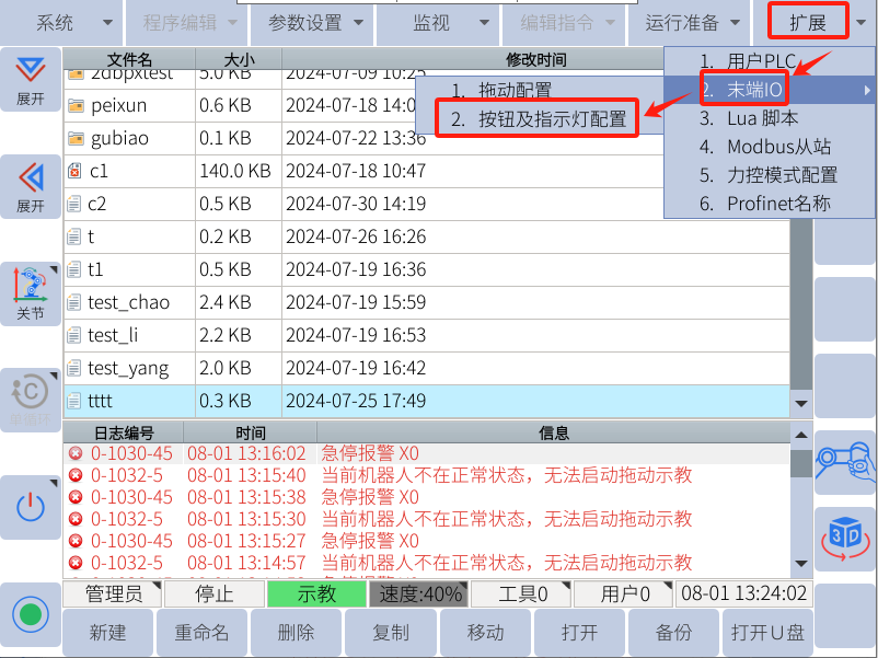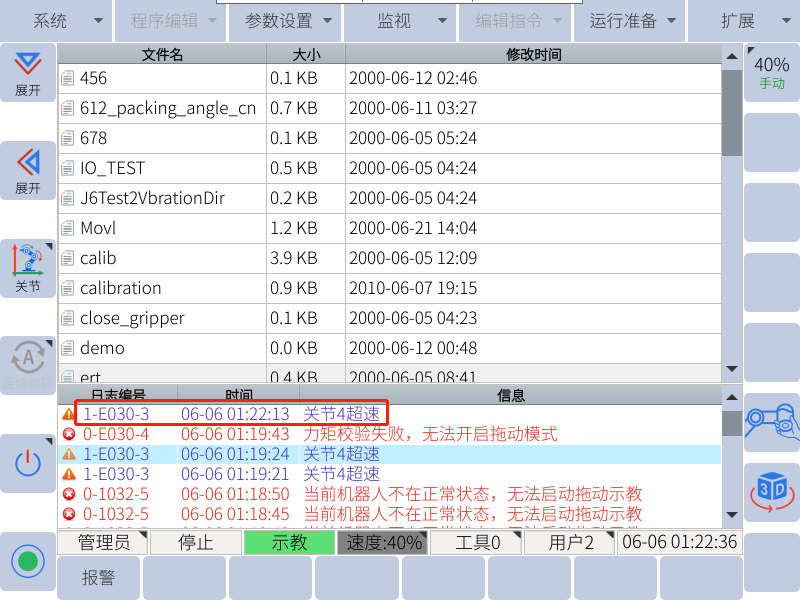 在按末端按钮进行拖动的情况下,如果点击按钮瞬间就拖动就会出现此类报警,我们应