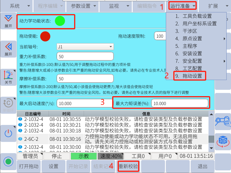 当动力学功能状态为红色时,需重新校验动力学功能,具体操作点击(运行准备--拖动设置--最大力矩误差)里调整最大力矩误差,默认为 10%(推荐按 2%一格逐级增加),然后点击【重新校验】,校验成功后,动力学功能状态会显示为绿色。