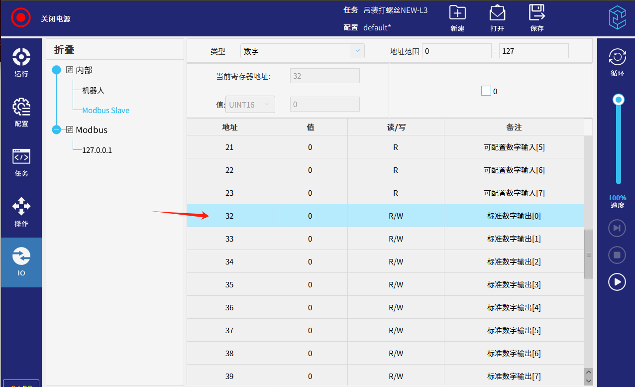 - 切换modbus,选择输入或输出信号。