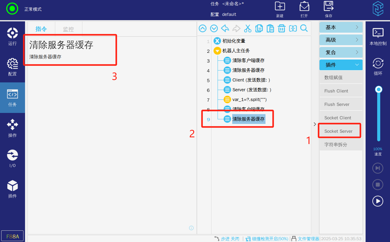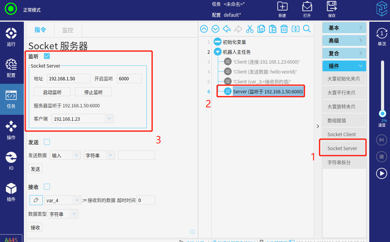 选择导航栏“任务”-指令栏选择“插件”-点击"Socket Server"-设置该指令(勾选“接收”-输入对应的数据类型)可以手动点击”接收“,也可以直接”运行任务“来接收