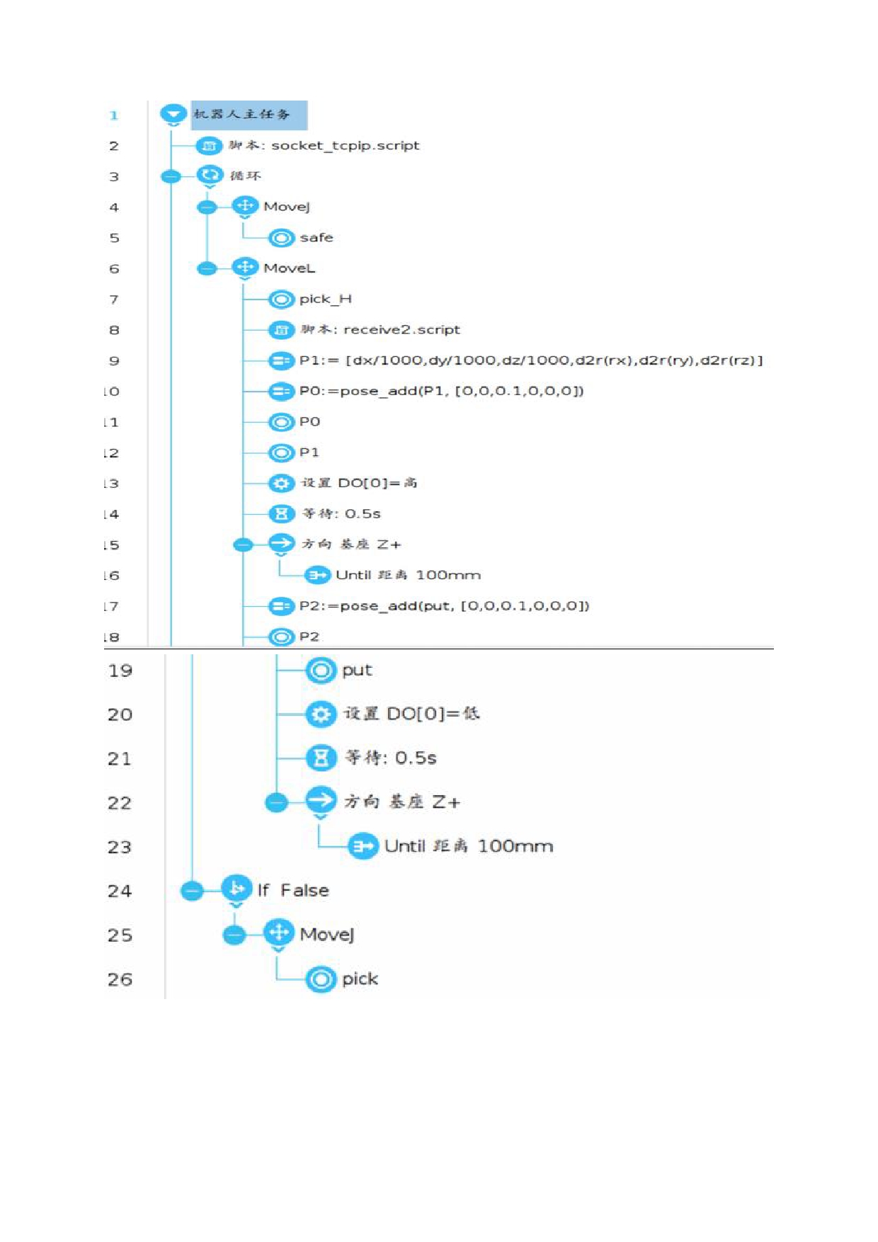 接收视觉坐标脚本程序 receive.script 如下图 6。视觉发过来的数据按照:"OK,1,2,3#"格式,第 1 位数代表标志符,拍照成功发送"OK",拍照失败发送"NG";第 2,3,4 位数分别是 X,Y,RZ 方向的偏移,数据用","隔开,末尾用"#"作为结束符。