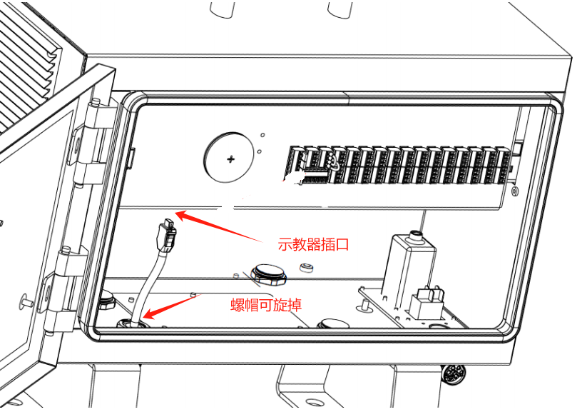 取出示教器,取下示教器线缆上的格兰头螺帽,将线缆穿过控制柜后盖连接至控制柜,如线缆连接好后拧紧螺帽紧固线缆即可。