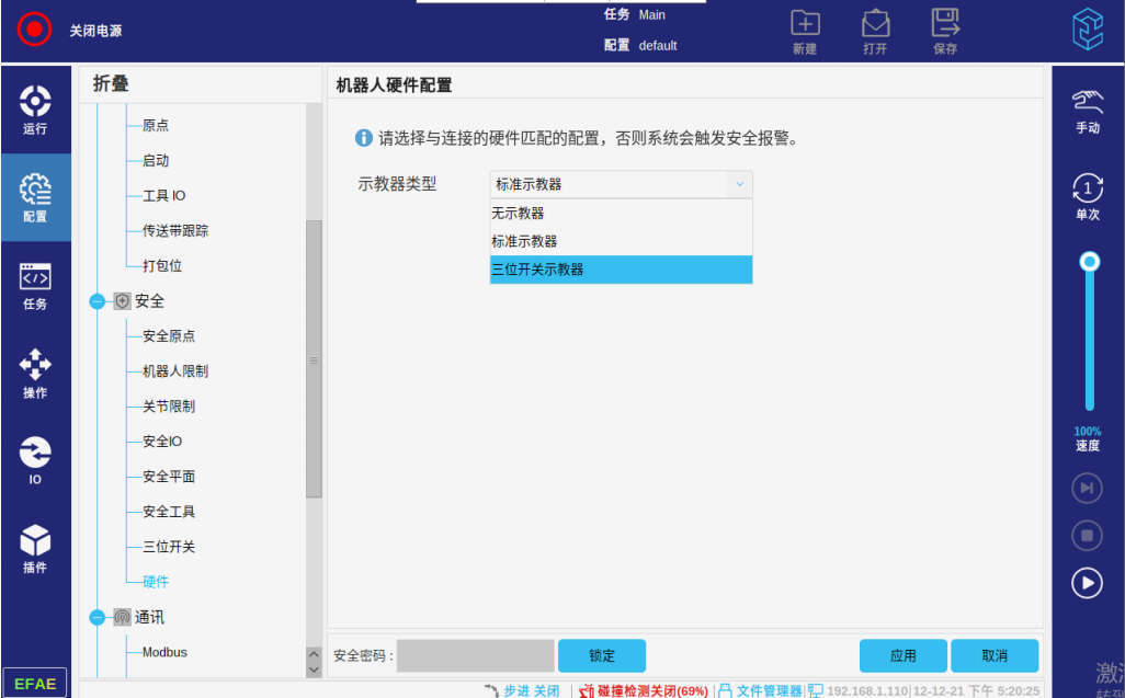 ● 点击“配置 > 安全 > 硬件”,点击“安全密码”输入密码解锁该界面。点击示教器类型