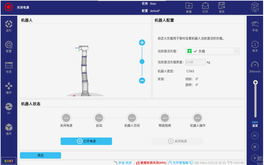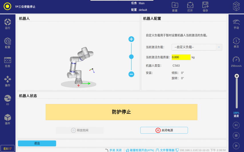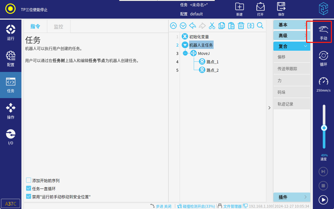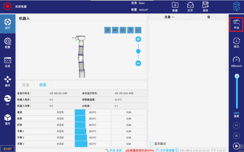 手动高速是指手动模式下任务运行时的高速状态,因为这不是一个常态化的功能,只是对于临时调试开放一下速度,所以速度条的调节不可以保持(松手后速度滑条自动恢复至默认速度250mm),需要在手动模式下任务运行后,手动调节速度滑条的位置并保持住,此时机器人会根据速度滑条的位置实时调整速度。