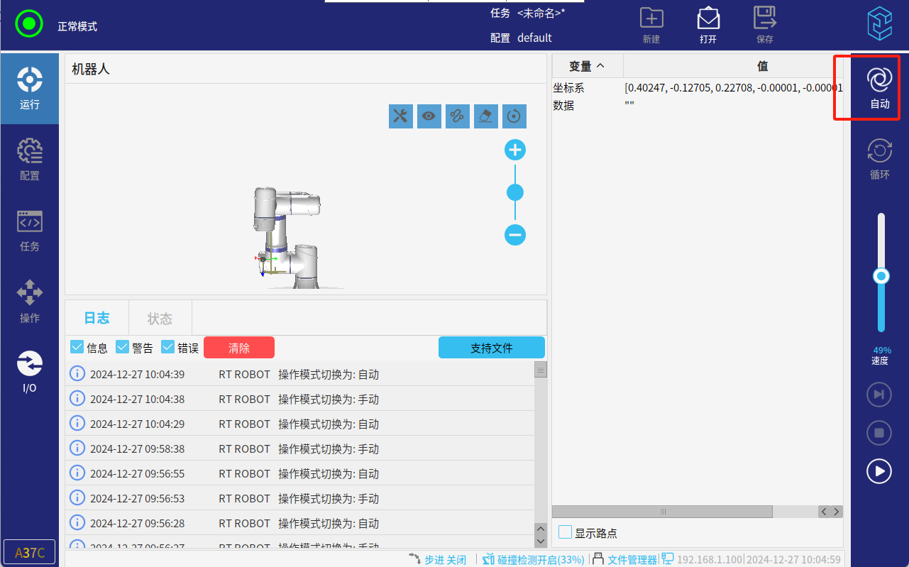 ● 程序编辑完成后可切换至自动模式运行程序,自动模式下无需按下三位开关可正常运行程序。