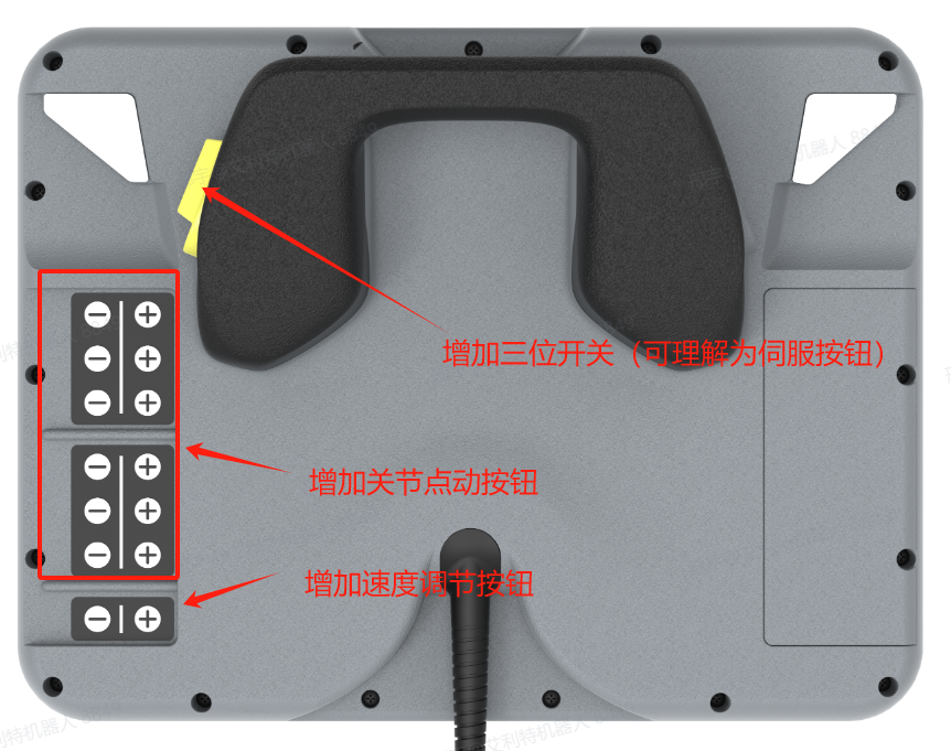 三位开关示教器:要先按住三位开关后方可操作机器人。