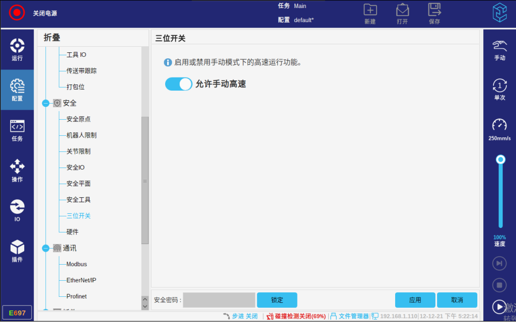 启用手动模式时,实时调整程序运行时的限速,需先启用“允许手动高速”,然后在右侧控制栏中调整实时速度。点击“配置 > 安全 > 三位开关”进入以下界面