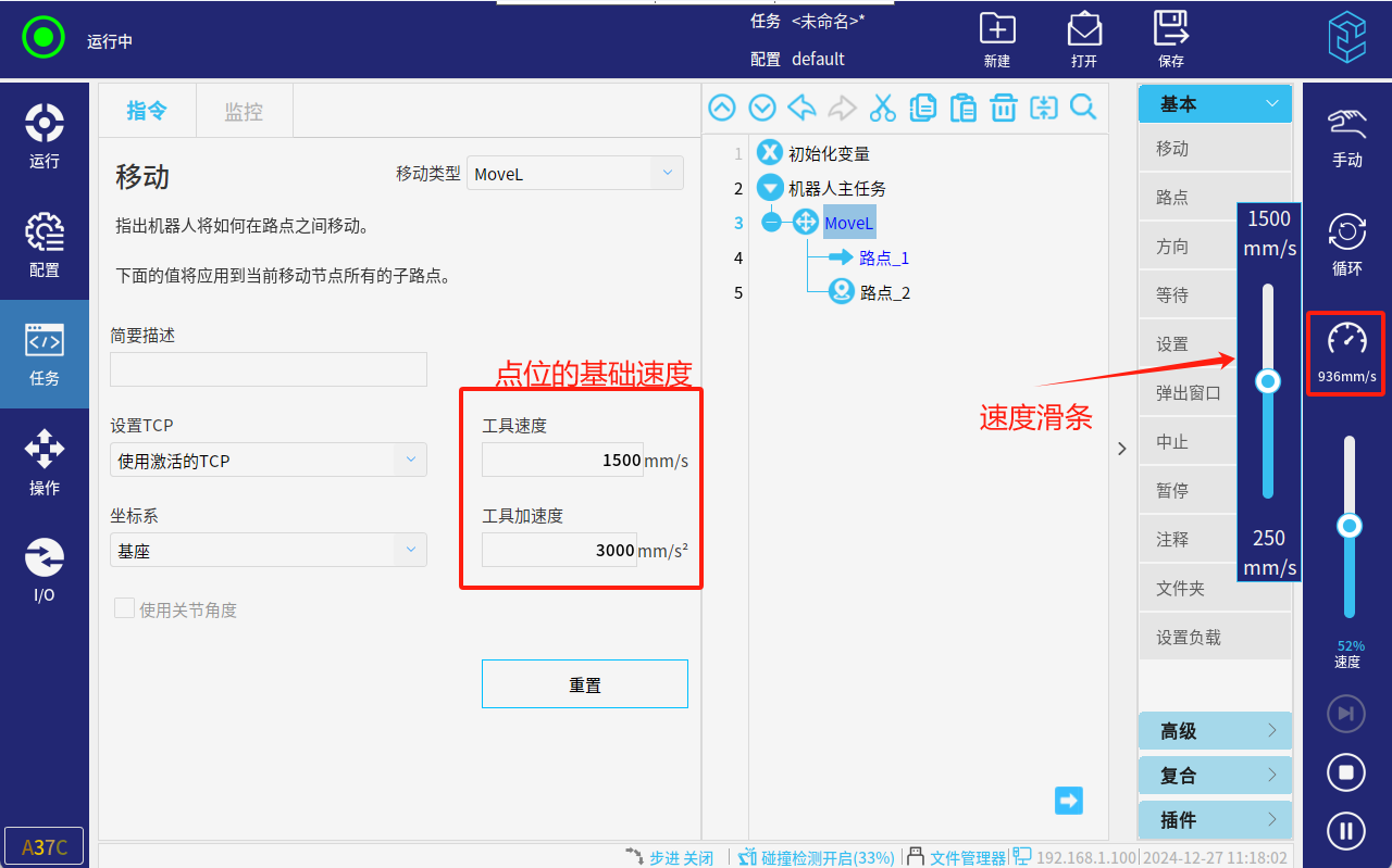 注:速度滑条的速度范围是250-1500mm,但在实时调节的过程中最大也不会超过点位的基础速度(点位速度如果低于250mm,调节速度滑条是没有效果的)。