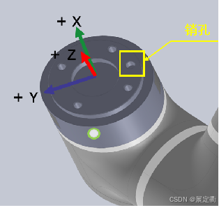 2. 注意安装方向,力控传感器的X,Y,Z方向要与机械臂的工具坐标系方向一致,可以参考下图确认安装方向
