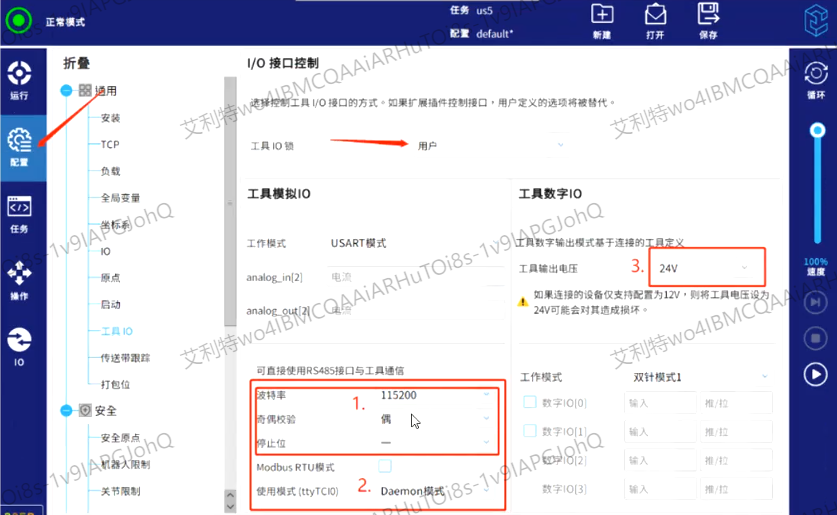 3. 安装好后设置工具IO的参数,工具输出电压,波特率,奇偶校验,以及使用模式,不同品牌的力控传感器参数设置不同,这个需要注意。如下图: