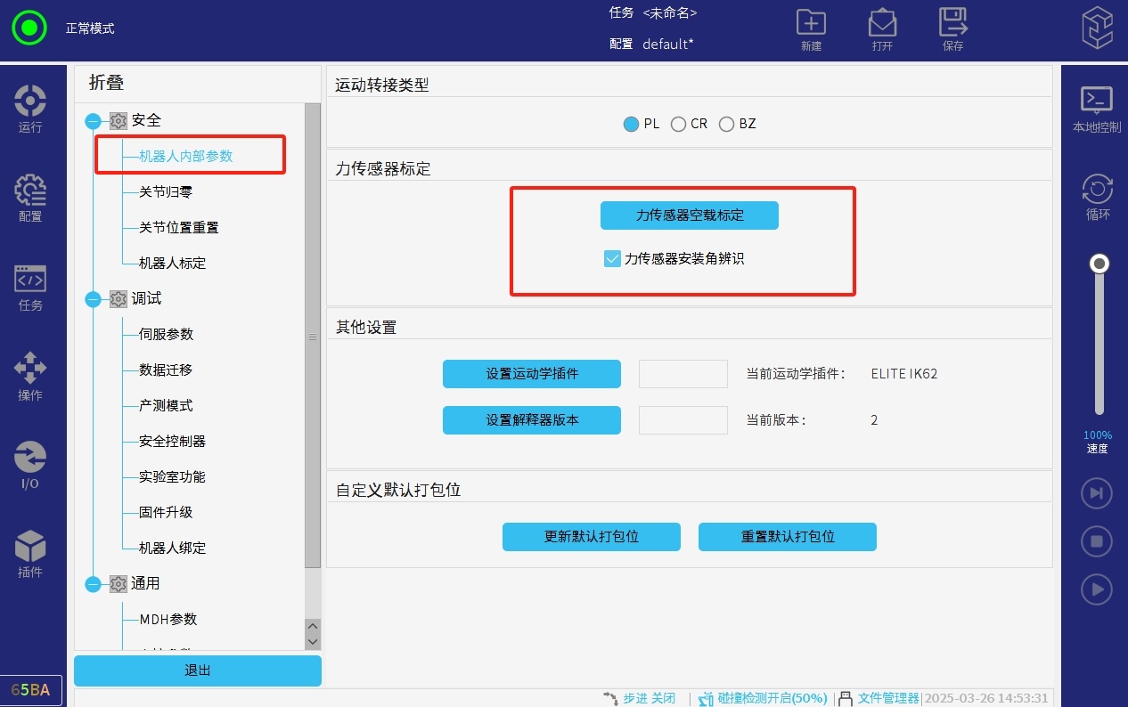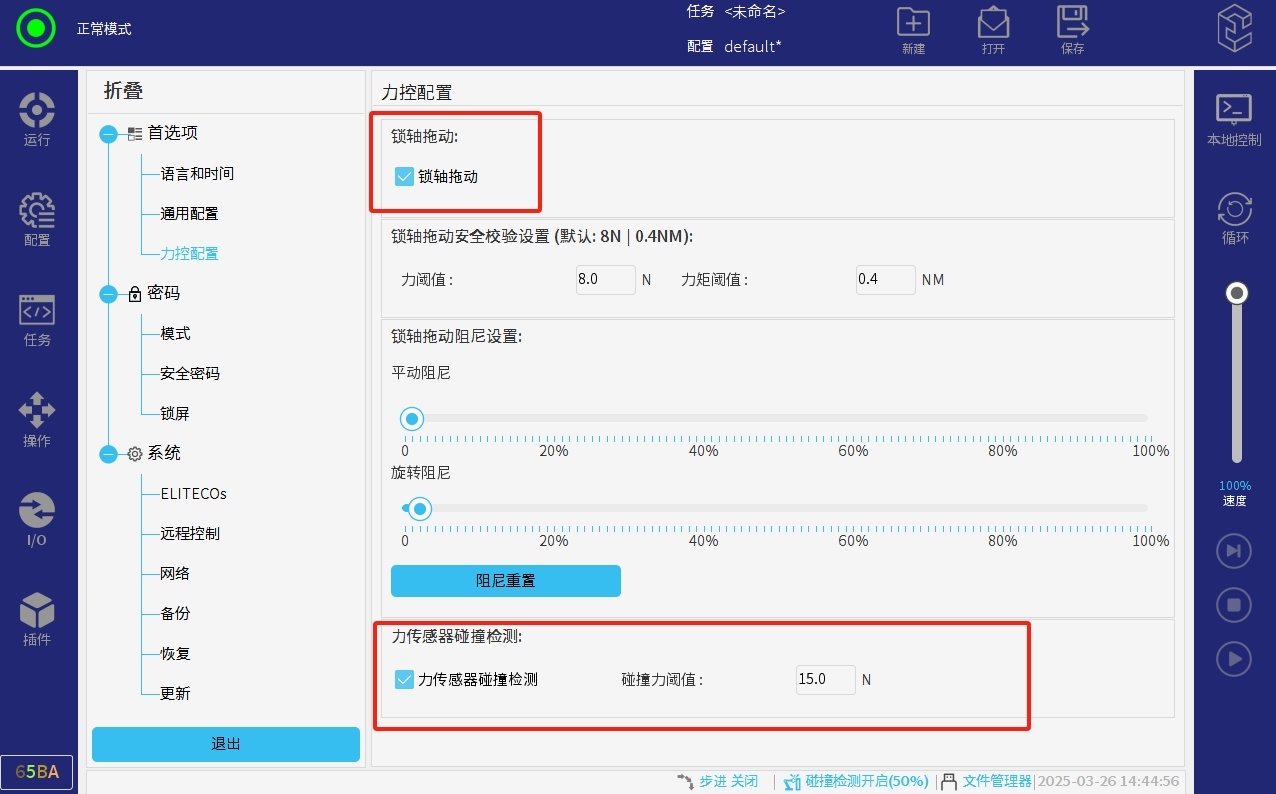 该功能需要打开力控插件,才能设置该参数,用户可以自定义碰撞力阈值,当力传感器末端如果感受到相应反方向的阈值的力,机械臂就会停止。