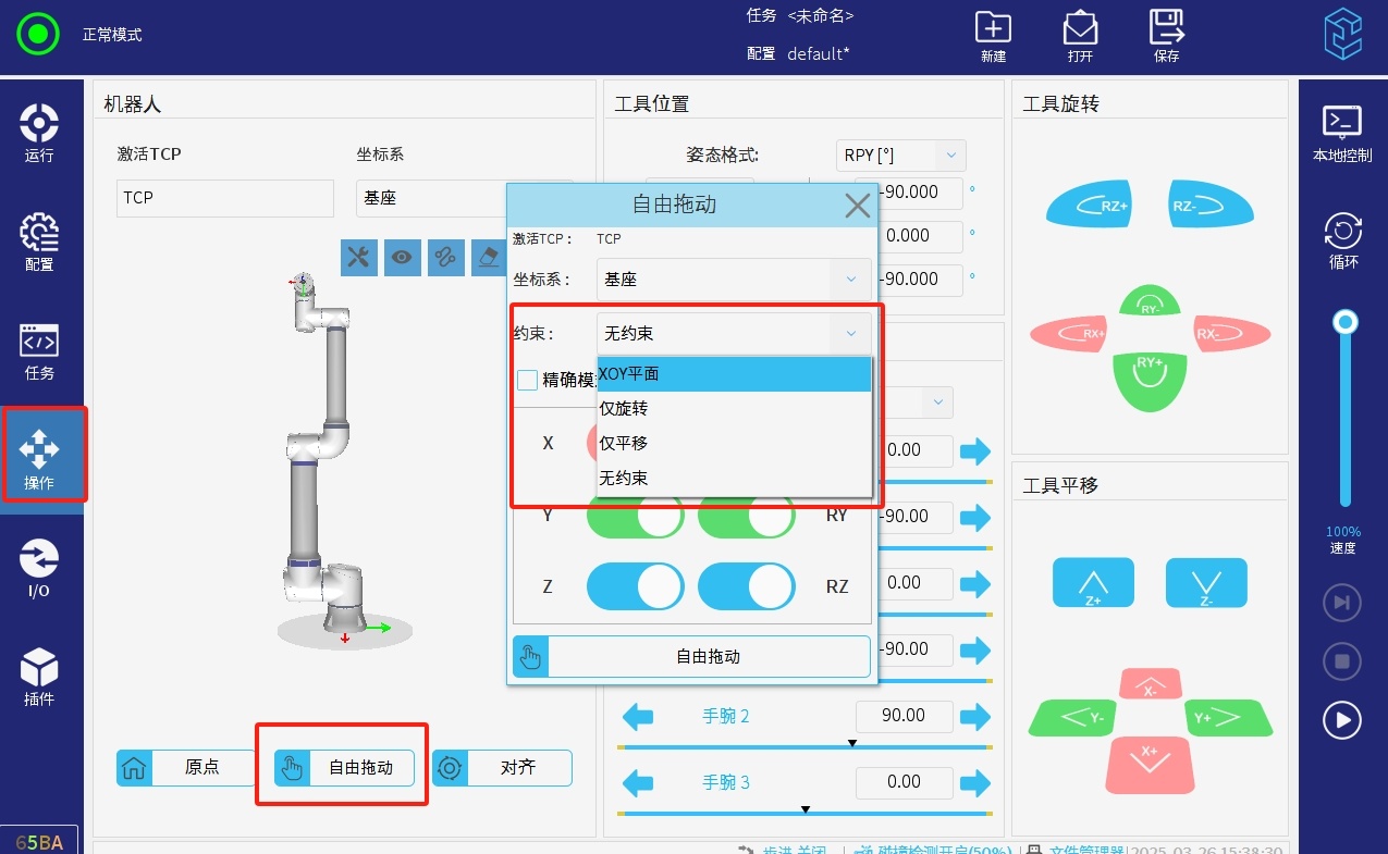 打开拖动界面,选择拖动限制,仅平面,仅旋转,无约束。