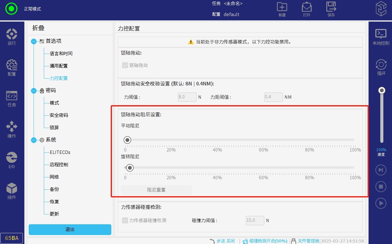 平动阻尼就是机械臂在力控模式下,朝X,Y,Z方向水平拖动时候的阻力,参数越大,拖动起来越费力。